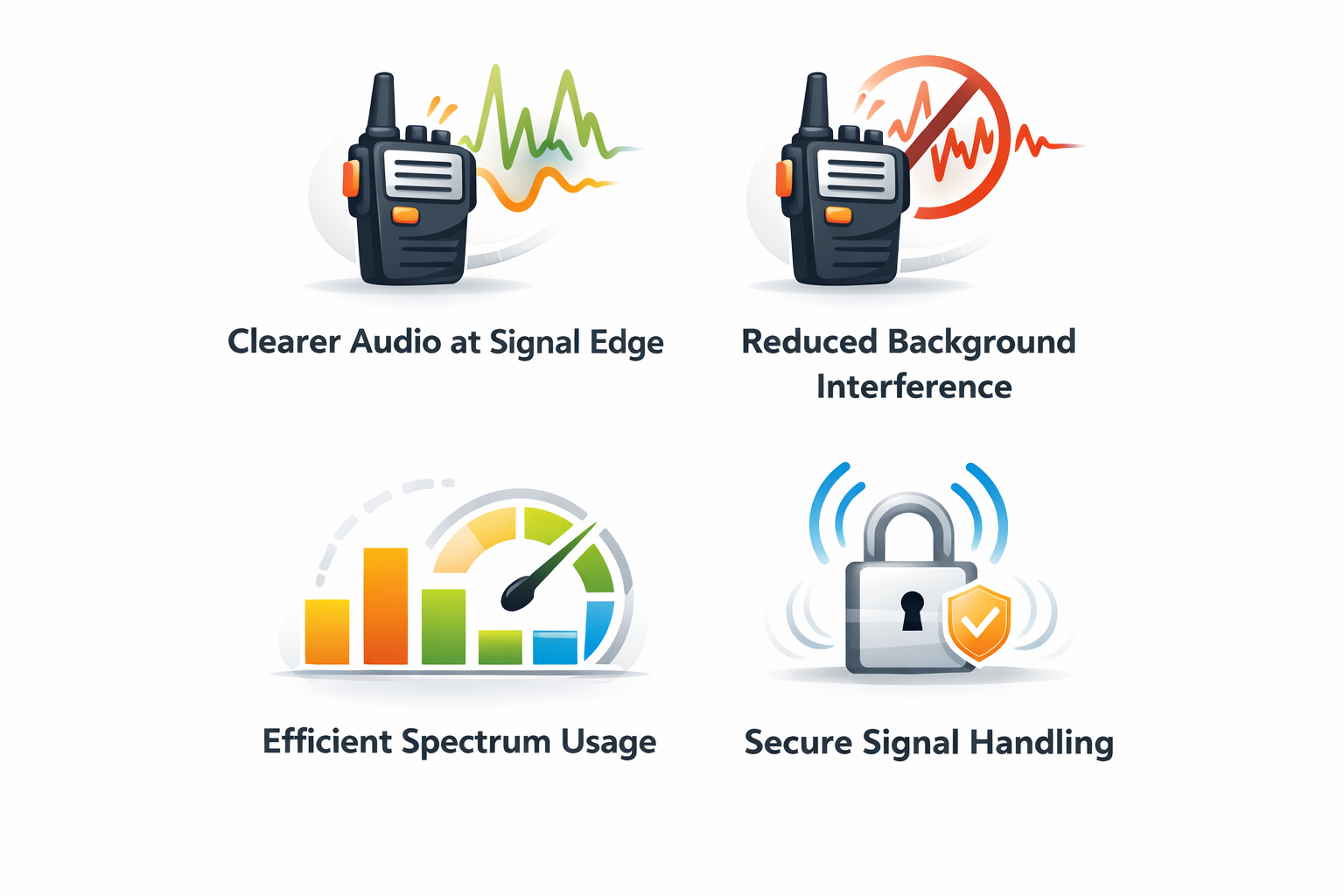 Digital radios convert voice into data before transmission. This allows the signal to be processed, corrected, and reconstructed at the receiving end for clearer and more consistent audio performance.