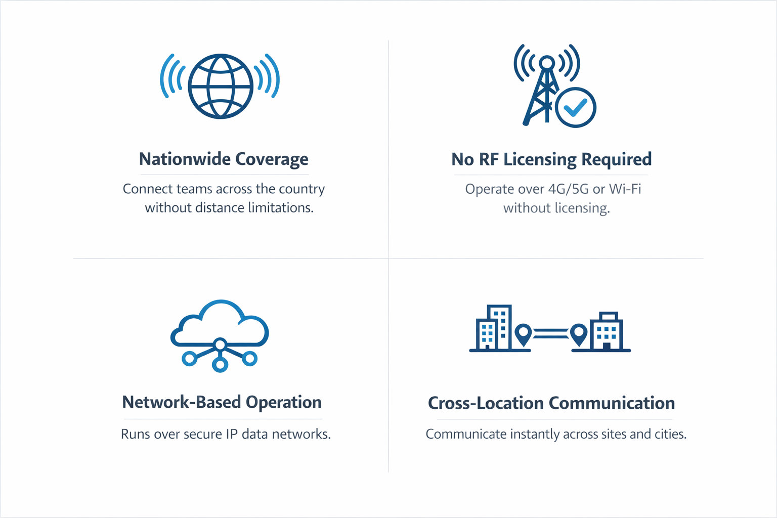 Delta PoC Radios transmit voice over secure cellular data infrastructure, allowing communication across cities, states, or nationwide coverage zones. By leveraging LTE, 4G, and 5G connectivity, PoC systems eliminate traditional RF coverage limitations and reduce infrastructure requirements.